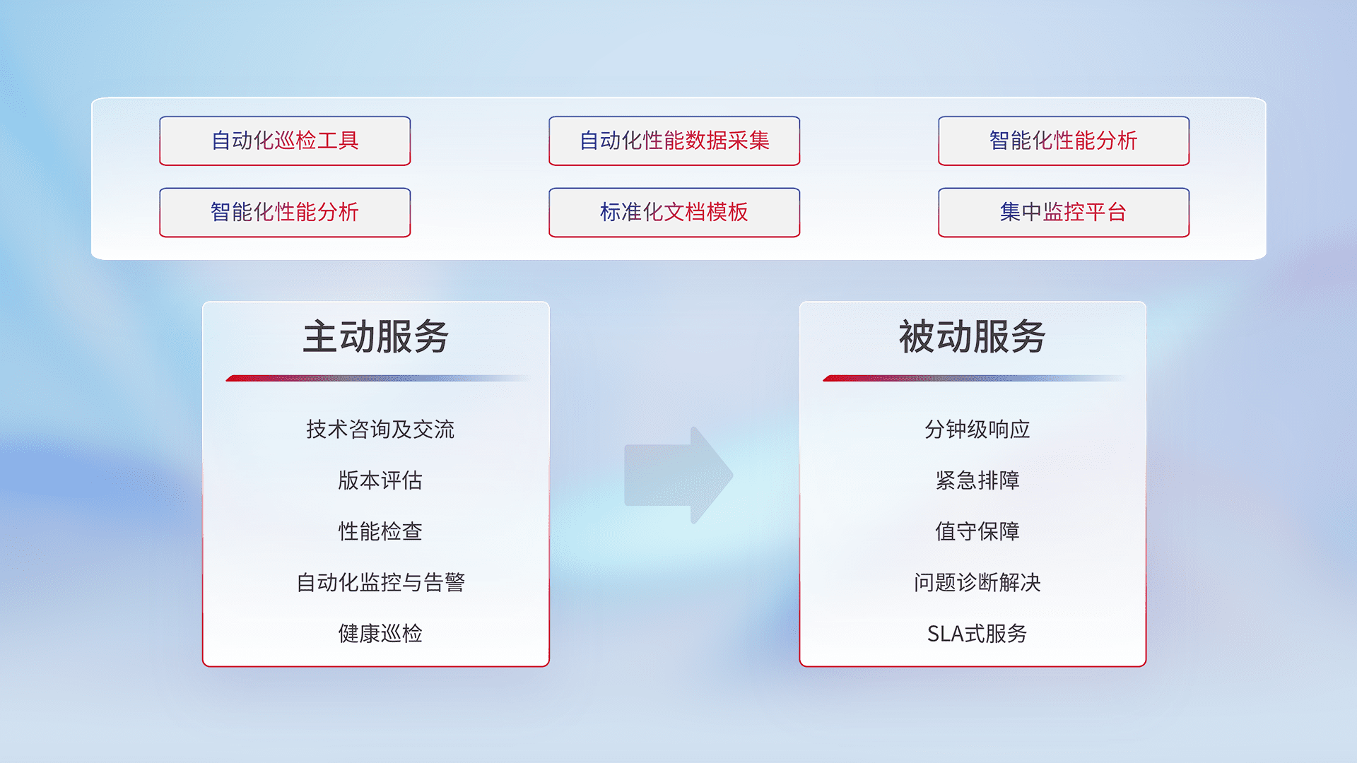 智能化工具和标准化文档,,保障服务质量,,,,提供主动服务(包含技术咨询、、版本评估、、性能检查、、自动化监控与告警、、、健康巡检)和被动服务包含(分钟级响应、、、紧急排障、、、值守保障、、问题诊断解决、、SLA服务)。。。。